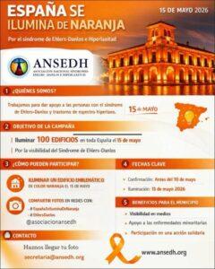 Bajo el lema de ‘una sola voz’, el Manifiesto 2026 pone el foco en la realidad de quienes conviven con estos pacientes. Este año, desde la ANSEHD han propuesto dos iniciativas durante este mes de mayo. Por un lado, han puesto el marcha el reto de iluminar 100 edificios o monumentos de color naranja en toda España para concienciar y dar visibilidad de este síndrome. Y como segunda opción, piden la participación a lo largo del mes de mayo en el reto “Caminemos por el síndrome de Ehlers-Danlos”. Para colaborar tan sólo es necesario inscribirse a través de la web: https://www.rockthesport.com/es/evento/caminemos-el-mes-de-mayo-por-el-ehlers-danlos y descargar el dorsal.